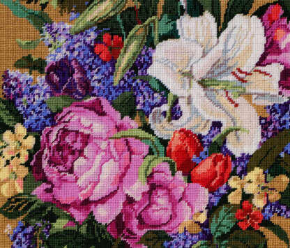 Designed by: Nancy Rossi. Lilies, roses, lilacs and tulips abound in this classic floral bouquet design by designer Nancy Rossi. This design works up just as well in needlepoint as in cross stitch since there is no backstitching and would look great in big stitch on 6 count Aida fabric.