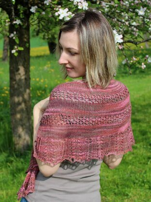This shawl is crescent-shaped and worked from the top down. The pattern comes in 3 sizes with both charted and written instructions.