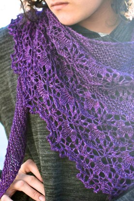 This asymmetrical, curved triangle shawl begins at one narrow end and increases to the border. Bands of garter stitch are separated by bands of lovely lace. A picot bind-off completes the elegant look.
