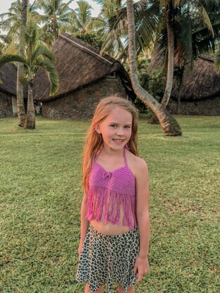 Introducing the Lily beach top! This light and textured summer crop top is designed for the ultimate beach experience. With its cute little bow and fringe accents, the Lily beach top is an adorable garment suitable for girls of all ages.