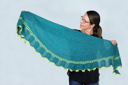Lime Dance is a lightweight shawl featuring the sumptuous ITO yarns, combining mohair, silk, wool and paper into an exquisite accessory. You will work a stocking stitch body that is broken through by eyelet elements and topped off by a stripe introducing a striking contrast colour in a mosaic pattern. The undulating Feather and Fan pattern of the edging bends the stripe into a playful wave that some lemon coloured picots are dancing on.