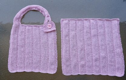 This matching Bib and Cloth are worked in an easy textured stitch. This design will suit either a baby girl or boy, and the three buttonholes allows the Bib size to be adjusted as baby grows.