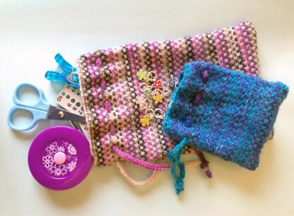 A simple hole free pouch, perfect to store your stitch markers or small notions. Use scraps of different coloured yarn, self striping or variegated yarn, full instructions are given to create various colour patterns. Despite appearances this pattern is straight forward and suitable for beginner/intermediate knitters, as you only knit with 1 colour at a time.