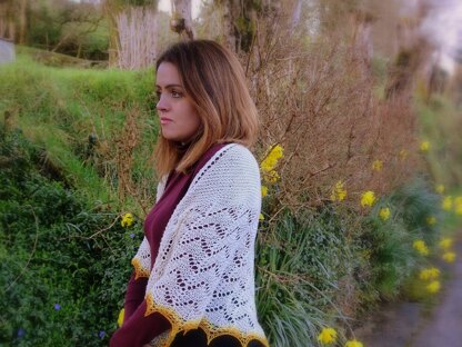 The shawl reminds me of limoncello ice-cream sorbet I used to buy when holidaying in Rome. The tones of yellow merging in chevron afghan stitch along the border of this shawl perfectly complement the off white hue of the main body of the shawl, which is suitable for a walk along a cool beach or an evening stroll sightseeing about town. The triangular shawl is knit top down in garter stitch, starting with a garter tap, increasing along 4 points before merging into lacy chevron and ending with two tone ombreesque afghan stripes.