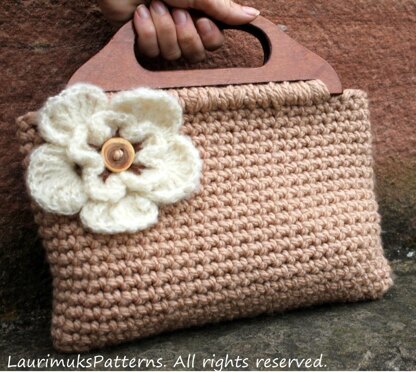Crocheted out of super bulky weight yarn in beige with large ivory statement flower and button for added appeal.