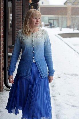 Stunning cables encircle the neckline of this light, delicate cardigan worked in stockinette. The Listopad women’s cardigan is worked top down from the neck entirely seamless. It’s version for adults of Dancing Leaves cardigan.