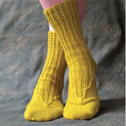 Little Bits Swings and Roundabouts is a celebration of the return of seasonal events - specifically the re-emergence of a few floral friends. You should be comfortable with basic sock knitting construction, but the pattern is easy enough for the adventurous beginning sock knitter - if you are comfortable with basic lace and cables you'll be alright. The construction is cuff down combining a lace cuff with knit and purl ribbing where the knit columns have off-set cable sequences that taper off into the instep design. Intended to be a mid-calf sock in height it can easily be customized for shorter heights (how-to instructions included in the pattern notes).