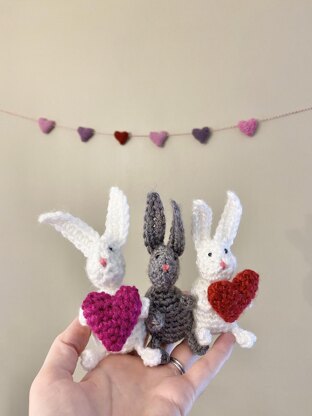 Some bunny will love this soft valentine! A perfect stash-busting project. Crocheted in worsted weight yarn this bunny will sit 5” tall at the top of the ears. Or in fingering weight yarn this bunny will sit 3” tall at the top of the ears and fit into an Altoids tin home. A puffy stuffed heart pattern is included to attach to the front paws. This is the perfect Valentines gift for little hands.
