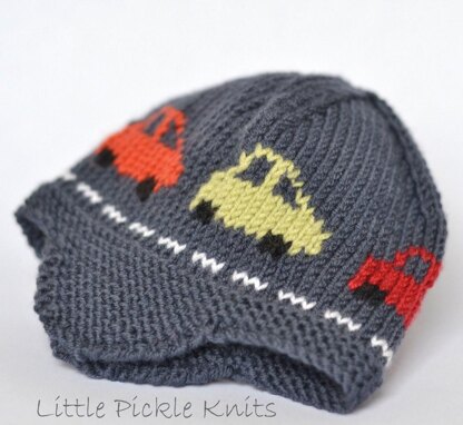 Little Pickle Knits Collection by Linda Whaley. Knit this 'Little Cars' Aviator hat to keep your little one cosy and warm. A fun hat that little boys will love to wear. The cars drive right around the hat.... Brrmm Brrmm! This Intarsia hat is knitted with Debbie Bliss Baby Cashmerino on 3.25mm (US#3) needles. You can also use Bergere de Fance Caline and other 4ply or US sport weight yarns.