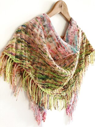 This is a bottom-up triangular shawl that starts with just 8 stitches and builds up and out each row with a 2x2 rib. The rib is opened up with carefully placed yarn-overs that are knitted over a 12 row repeat and then dropped to create the open, water-like flowing pattern.