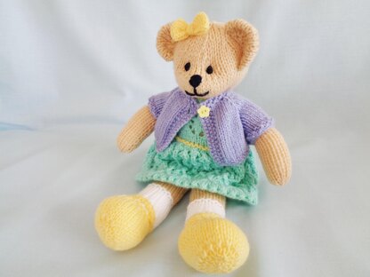 Bethann is a cute 12 inch (31 cms) teddy bear knitted in DK yarn. Lacy dress and Shrug/short sleeved cardigan are also in DK yarn and are removable.