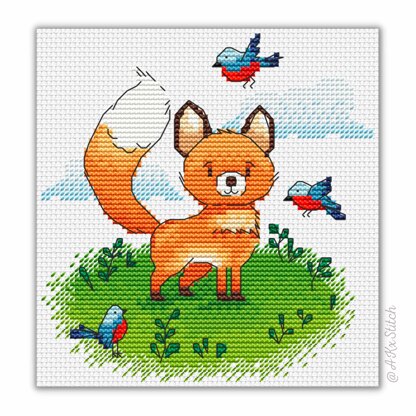 Little Fox Counted Cross Stitch. Easy to Follow Embroidery Chart featuring a cute baby fox and little birds in bright modern style. Great handmade gift idea for baby announcement or nursery wall decor.\n\nSize: 70w x 73h stitches\nStitched on Aida 14ct: approx 13 x 13 cm (5 x 5 in)\nDMC Threads: 20 solid colours (4 blends)\nUsed stitches: full cross stitch, half cross-stitch, backstitch\nSkill level: Easy / Beginner\nStitch time: 13-20h\n\nCross stitch pattern in PDF, Instant Digital Download includes: 1) cover page with preview; 2) instructions, symbols key and shopping list (DMC thread colour numbers and estimates, as well as fabric options); 3) two black and white charts, with and without backstitch; 4) two colour charts, with and without backstitch; 5) single page PDF for Pattern Keeper (available on request).\n\nPlease note: This pattern is for personal use only - not for commercial use. You can't make copies of our charts to distribute (either as PDF or printed versions) but you can definitely sell your finished cross stitch work.