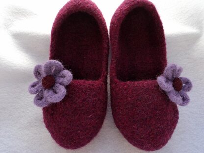 The slippers are knitted in the round as well as straight knitting and uses 100% wool worsted weight yarn, basic knit stitches, 24” circular needles. Skill level, easy to moderate, short row knitting involved. Machine washing for felting technique.