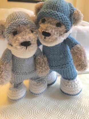 Shoes and clothes are knitted on, just the hat and mask are separate. Little Hero feet, legs and body are knitted as one piece, flat, head, ears and arms are knitted separately and sewn in place. I have included a step by step making up guide which is full of photos to help.