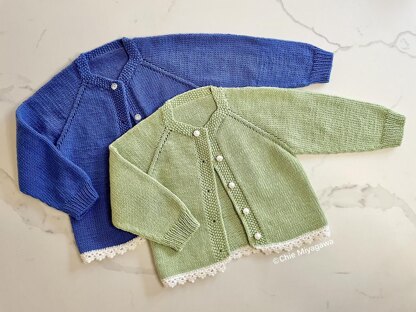 An elegant cardigan is a must have for your little princesses' wardrobe! It layers perfectly on a dress and compliments a pants look as well. The cardigan is knit top down seamless with raglan sleeves. You can skip the lace if you are knitting this for a boy and substitute with a ribbed finish! If you are not familiar with the short row back neck shaping, this might be the perfect project for you to expand your skills. Have fun! Sizing: 6-12M / 1-2yr old / 2-3yr old - Chest width: 27cm (10.6") / 29cm(11.5") / 30cm(11.8") - Length from back neck: 30cm (11.8") / 34cm(13,4") / 38cm(15")