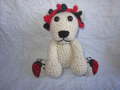 This little bear is the biggest ladybug lover around. She measures approx. 6 inches sitting up and 9 inches laying flat. She has a removable headband (not attached) and adorable ladybug feet.
