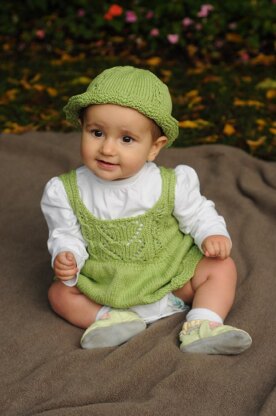 Dainty lace bodice is knit in 2 pieces and assembled with the skirt being knit from the waist down in the round. Hat is knit top-down in the round and both hat and skirt are edged with knitted Rick Rack stitch. Neckline and armhole edge are finished with single crochet.