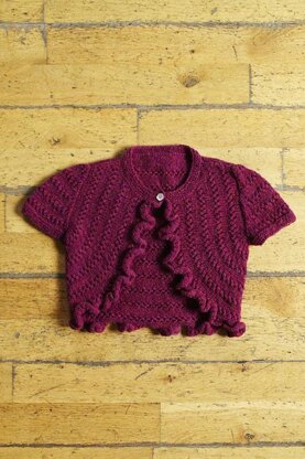 Features: Interesting construction - the front looks horizontal and the back looks vertical Sleeves worked from top down using short-row technique, so no sewing-up required Pretty ruffled edges around the hem Cute and versatile bolero for girls