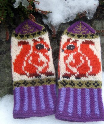 Another kids squirrel pattern. I didn't plan to make any more squirrels (tried to stop!) but just doodled this one out. Squirrel disaster! The same size as my other kid's mittens. The pattern has charts for left in right hands and thumbs in full color; there is no written instructions. Few stitches are embroidered with duplicate stitch.