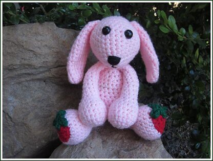 The Little Strawberry Bunny measures approx. 6 inches sitting down and 9 inches laying flat. The red part of the strawberry is crocheted as part of the leg, and the leaves are attached using a yarn needle.