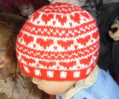 It has a two color ribbing, little hearts and a little border pattern. At the top is a red star.