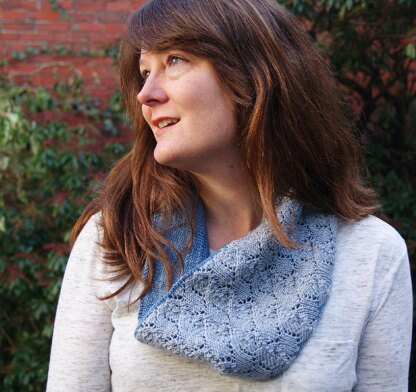 The sample shown was knitted in Lillian by Dirty Water Dyeworks in shades Drizzle and Mountain Mist.