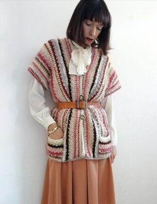 A tactile, super soft, short-sleeved cardigan, in a rich combination of textures. Different stitches and yarns give this design its unique look. Inspired by the casual-but-chic style of the late 1970’s, this versatile cardigan with deep patch pockets and buttons can be dressed up or down. Suitable for a beginner. The ultimate stashbuster!