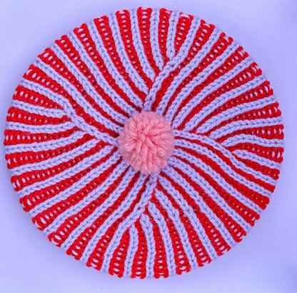 The Lollipop Beret is worked bottom-up in one piece, with no finishing required. The beret is knitted in two-color brioche (full brioche) with a rib edge and a pompom on top. Knitting two-color brioche is no harder than one-color brioche, since you only work with one strand at a time, so feel free to play around with fun color combinations!