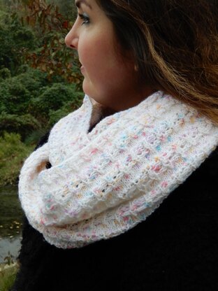This long infinity scarf is worked in a very stretchy stitch pattern. Using fingering weight sock yarn, it is a lightweight accessory that will still keep you warm in winter. The stitch pattern is reversible, either side looks good.