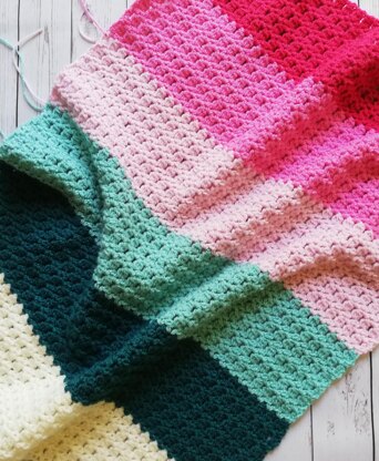 I made the blanket in the photos using Stylecraft Special DK but it works equally as well in any weight yarn providing the same is used throughout. If you are making a pram blanket you will need approximately 50g of each colour.
