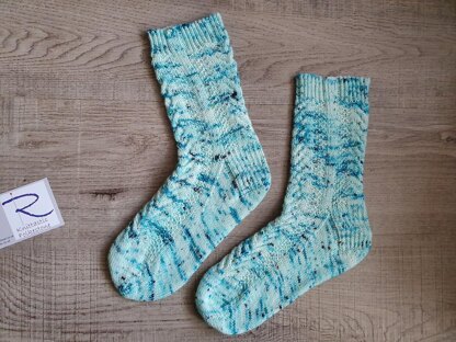 The sample socks in the photographs are the larger size, knit in a fingering weight 75% merino/25% nylon blend sock yarn from Devon Sun Yarns. A semi-solid or speckle yarn would work best for this design.