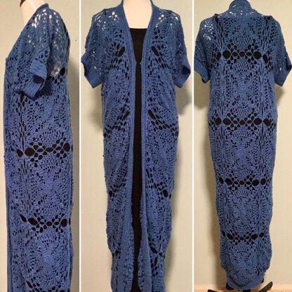 Laid flat (unstretched) after blocking, the garment measures 56”(140cm) in length from top to bottom hem along the back center and gradually decreases to 52”(130cm) long in the front. The cardigan measures 23”(57.5cm) across front from underarm to underarm and 27”(67.5cm) from sleeve hem to sleeve hem. Suggestions are provided in the pattern to alter the fit slightly.