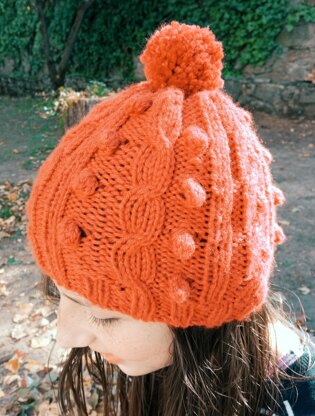 Long road hat is knitted in the round with a scheme of cables and bobbles and a small pompom on the top. You will need around 80 gr. (130mts) of any yarn suitable for 5mm (US 8) needles. Size is for chidren from 5 years old.FOR OTHER SIZES: change the yarn weight and the needles to get a smaller or bigger size. Suggestions of yarns are included in the pattern. Gauge: 18sts and 19 rows: 10 cms. Final measure: 8.5 inch. long (without pompom) 7.4 inch. width (without streching)