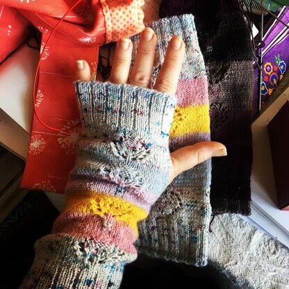Your favourite scraps, a tiny bit of colour work, a little bit of lace, a place for your thumbs, and there you are. A lot of fun to knit and meant to look a little bit slouchy and oversized. There is 3 sizes, so it is your choice how tight or relaxed you want them to sit on your hand.