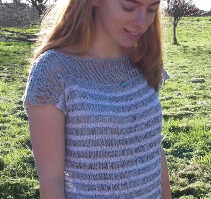 A quick-knit top with easy crochet detail. Back and front knitted pieces have slight waist shaping. Then the crochet is added along the top of each piece to form the boat neck yoke and cap sleeve and echoes the “dropped” stitch of the main body of this pretty easy-to-wear tee.