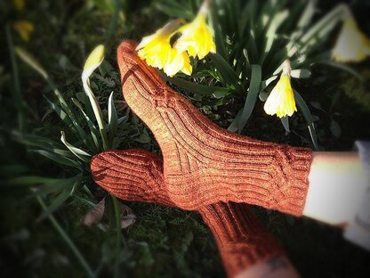 Photos show socks knitted in Saffron Colourway, from Madeleine Tosh Sock.