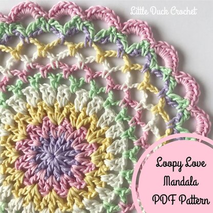 The finished mandala measures approximately 10" in diameter but if you do use different yarns and hook sizes, the size will vary.