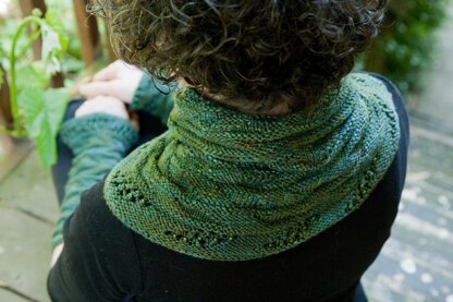 The sweetly shaped Lorelei begins with the Moebius cast on taught by Cat Bordhi, and features a knit/purl pattern reminiscent of drifting seaweed. The cowl is delightfully slim and form-fitting, allowing many options for wearing: it will easily fit inside a jacket or coat, or just as easily be worn as a lovely topper on its own. The cuffs are long and flare slightly at the hand. This set is guaranteed to be well-used, incorporating the best qualities of beauty, form and function.