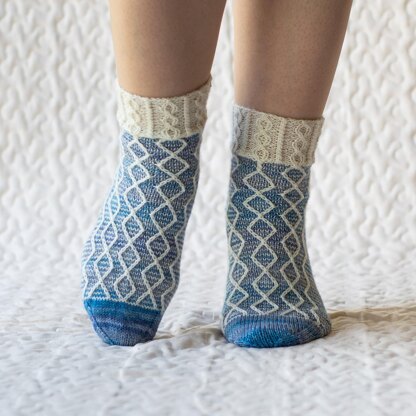 Lorelei Socks knitting pattern is designed to captivate both the knitter and the wearer, offering a unique blend of texture and style. Each round is worked with a single color, utilizing slipped stitches and cables to create a stunning, textured design that stands out. These socks are knit from cuff to toe in the round. The pattern features a French heel, which provides a perfect fit.