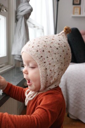 The Lorna bonnet features a seed stitch band and simple colorwork pattern. The first part is knit flat and then joined in the round and shaped at the back to contour the head for a nice fit. The bonnet is finished with an i-cord tie and a pompom at the top!
