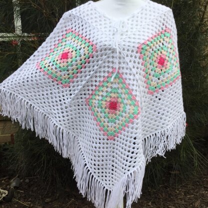 This pattern is for a granny square poncho. This poncho is constructed using 6 large granny squares. In this pattern you will learn how to easily join the pieces together and how to create a fitted neck piece for it. This pattern also has many techniques and tricks to put together a beautiful poncho.