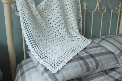 It uses the popular Lotte Lace stitch pattern worked corner to corner with the addition of filet crochet border finished off with lacy shells and picot stitches.