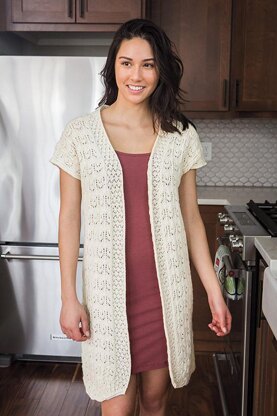The Lotus Lace Cardigan is an open front sweater worked flat from the bottom up. Cap sleeves are worked at the same time as the body and a lacey band is picked up along both fronts and the neck. 4” positive ease.