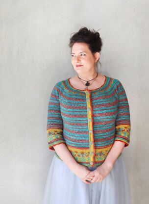 This is a pattern for a top down cropped cardigan with a circular yoke 3/4 length sleeves, worked in the round and with a bit of short row shaping at the neck, a steek, and using the stranded colourwork technique. There are also instructions for crochet stitches and edges which are optional, but shown on the sample.