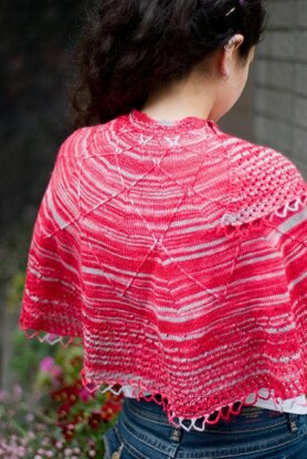 This shawl is knit from the top down starting with a garter tab. When finished it makes almost a complete circle. The central design of the pattern is accomplished using slipped stitches.