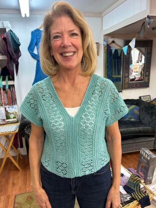 This top is knit sideways in two rectangular panels, starting at the center and ending at the sleeve cap hem. The fabric alternates between a modified garter stitch and easy lace sections. Once completed, the panels are blocked to size and then seamed on sides and center back/front. Suggestions are provided for making the top longer or wider. This will require additional yarn.