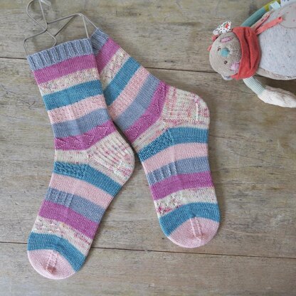 These socks are lovingly covered in different patches just like our poem. The pattern contains three sizes, small, medium, and large. These socks are knit top down with a slip stitch heel flap and a gusset construction. There’s enough detail and variation in the pattern to keep the knitting interesting, but nothing that should be too tricky for a new sock knitter to master. This whimsical design would look beautiful in almost any yarn, perhaps you could raid your scrap basket for the perfect shades to represent your well loved cuddly companion