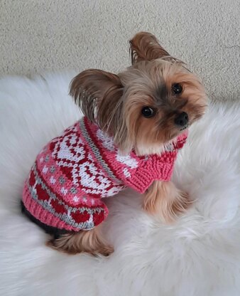 Love Is In The Air. An adorable small dog sweater filled with hearts to show off how much you love your dog. A must for Valentine's Day! The sweater is made from the neck down in order to accommodate any length of dog.