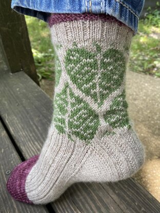 I love the bright pop of purple in the spring that comes with the blooming of the Eastern Redbud trees in the midwestern US. These trees also have lovely heart-shaped leaves which were the inspiration for these socks. The heel flap incorporates slipped stitches for strength and durability. The remainder of the sock is worked in ribbing to provide a great fitting sock.