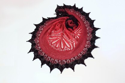 This fingering weight shawl is worked top down from the garter tab cast on to the lace edge. The beginning lace section shows the blossoming love, like rosy petals full of hope and faith in the future, reaching out and unfurling towards the sun. The lace border shows the unraveling, the dissolving of dreams. A simple
